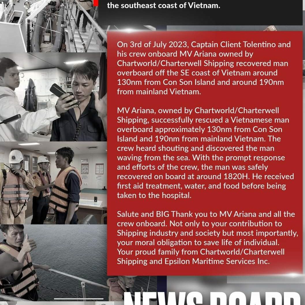 En route to Singapore, the crew saw a man waving from the sea. The Ariana recovered the man who had gone overboard off the SE coast of Vietnam. They then proceeded to hospital for some first aid treatment, water and food.